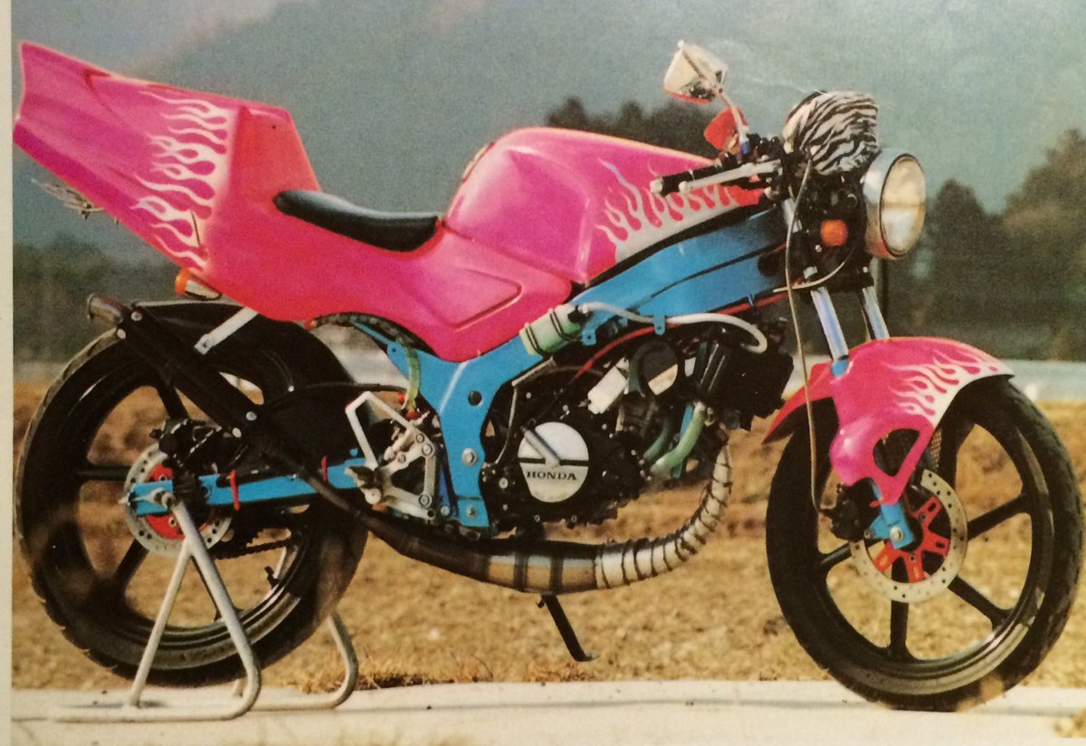 ばいくのはしりや Twitterissa 前回に続きキワいマシンと言えば Rt格好番長 千葉支部 ちゃとう氏のnsr50 Rs125アッパートーマス加工にあみ玉ファイヤー 誌面には制作費用 半年間一日平均0 7食 2回ダウン とのコメントが Http T Co Gncj9awb1u