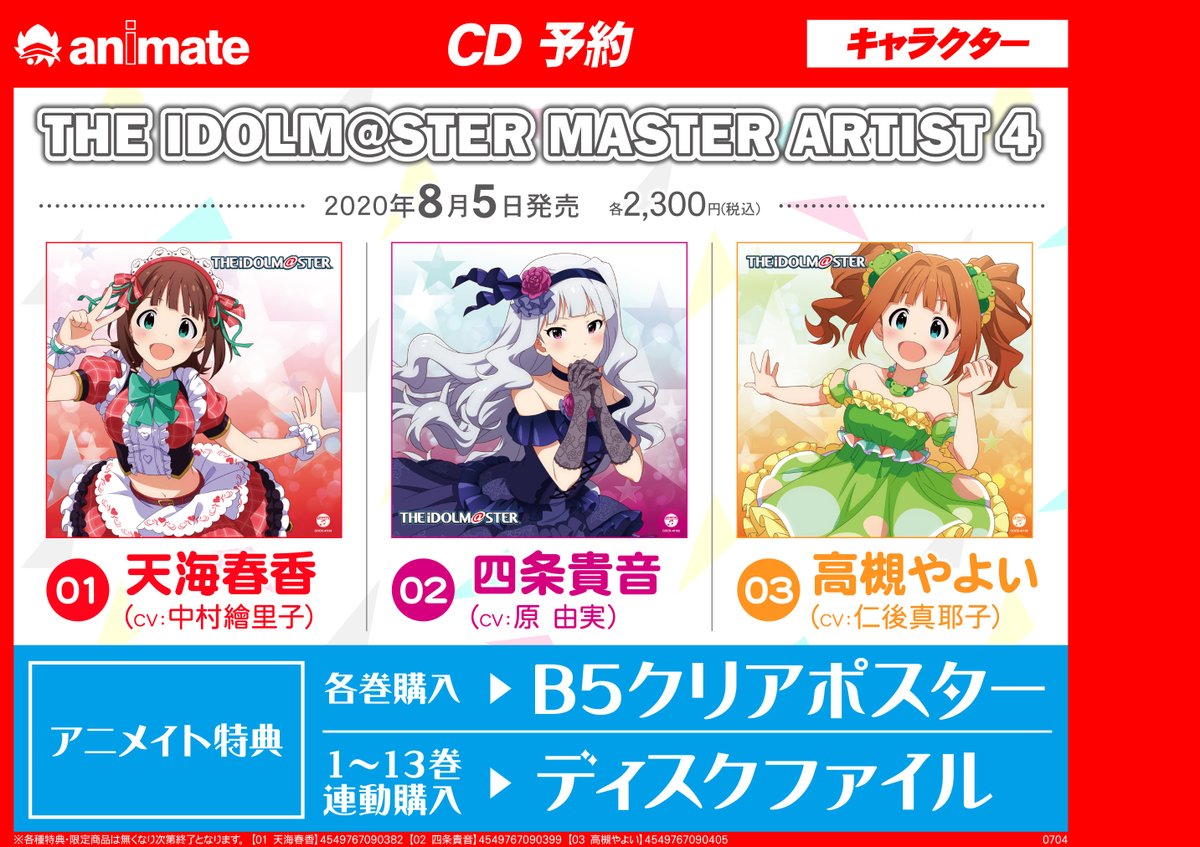 アニメイト旭川 On Twitter Cd入荷情報 The Idolm Ster Master Artist 4 01 天海春香 The Idolm Ster Master Artist 4 02 四条貴音 The Idolm Ster Master Artist 4 03 高槻やよい 本日入荷しましたアサ アニメイト特典 B5クリアポスターですアサ